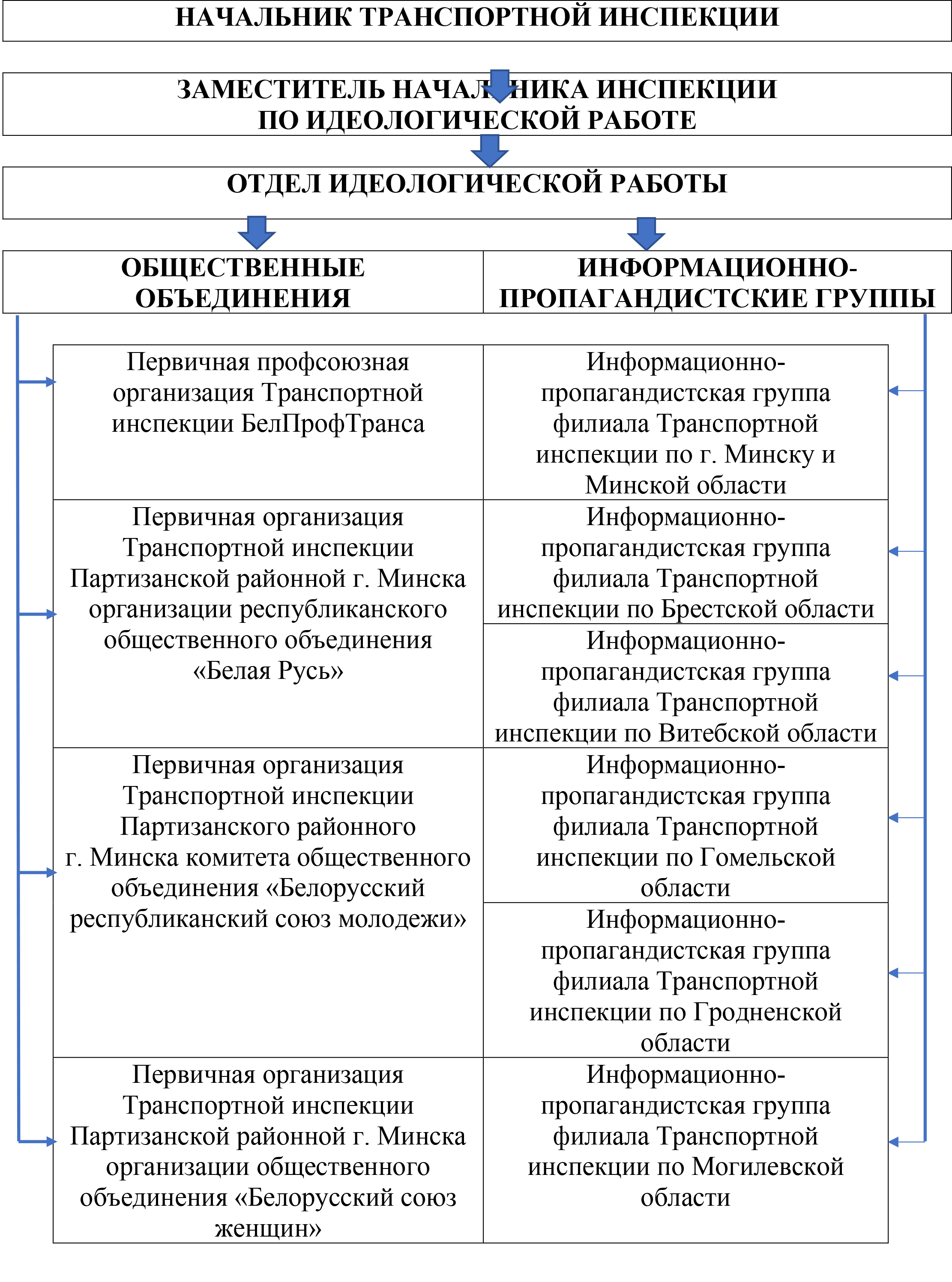Деятельность первичной организации РОО «Белая Русь осуществляется на основании современных тенденций идеологии Белорусского Государства, ориентирована на вовлечение в ряды организации преимущественно лиц молодого возраста. Численность первичной организации РОО «Белая Русь» увеличился. Авторитет и роль общественного объединения растет среди работников Транспортной инспекции всех возрастов.
